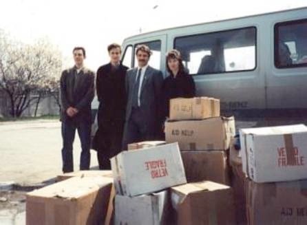 Ukraine Die erste Hilfsfahrt des IKJH e.V. ging im Jahr 1992 in die Ukraine. J.Allgäuer übergibt Medikamente an das Kinderkrankenhaus in Slavotitsch bei Tschernobyl. H. Benziger und N. Behr (v.l.) bei der Übergabe von Elektroinstallationsmaterial an eine Selbsthilfegruppe in Sewastopol.